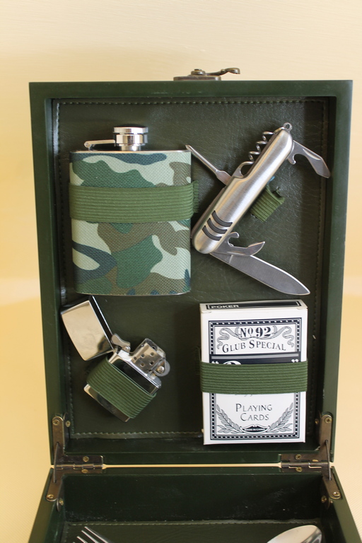| اجزا ست | قمقمه کوچک ، قمقه بزرگ ، قاشق و چنگال ، فندک زیپو (بنزینی) ، ناخنگیر چندکاره ، کارت بازی |